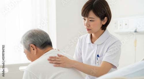 nurse, woman, patient, back, sudden change, hospitalise, hospital, clinic, aged, aged, asian, japanese, grandfather, bed, 30s, marode, injury, people, work, breath, stern, cough, apprehension, aspiration, rehabilitation, attack, nurse, care, medical care, ward, support, support, cuddle, unrest, symptom