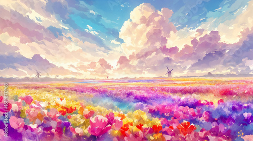 夢見るような カラフルな 水彩の花畑と風車 壮大な空の風景