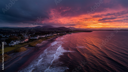 sea, wave, coast, beach, sunset, red, magenta, silhouette, cloud, dramatic, textured, cadence, house, roof, horizon, aerial, panorama, shot, construct, depth, atmosphere, drama, summer, nature, landscape, summer, travel, passion