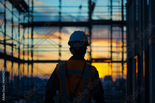 working man, construction site, dusk, helmet, architecture, scaffold, crane, industry, occupation, labor, sunset, silhouette, ai