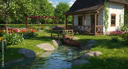 house, garden, house, stream, flower, grass, wood, bridge, boat, rock, green, nature, landscape, spring, summer, calm, peace, lovely, garden, calm, refuge