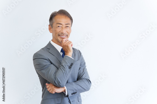 man, business, businessman, aged, aged, trouble, contemplate, smile, positive, imagination, thought, consent, office, middle-aged, japanese, asian, 60's, suit, salaried employee, employee, work, work, boss, expert, president, executive, carrier, beard, beard, white background, people