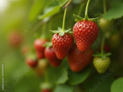 輝く太陽の下で熟したイチゴが緑豊かな葉の間から吊り下がっている爽やかなクローズアップ