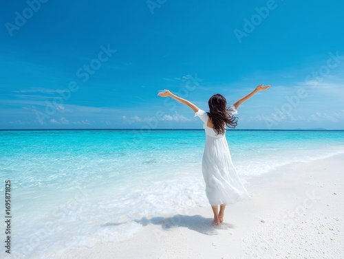 白いワンピースの女性が海辺で両手を広げて立つ風景