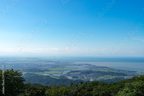 blue skies, view, town, japan, copy space, green, sea, coastline, stream, mountain, nature, forest, wood, lookout, skyline, panorama, landscape, sky, sunny, plant, beach, open air, travel, verdure, summer, cloud, light