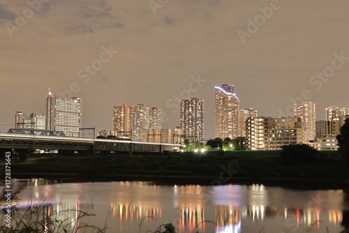 kawasaki, kanagawa, tokyo, nightscape, night, sunset, landscape, stream, river, bridge, waterfront, bank, house, highrise, building, transportation, suburban, background, copy space, lighting, neon, development, japan, city, building, light, water surface