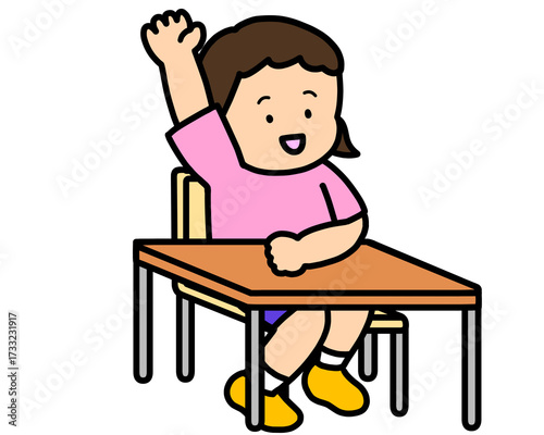 挙手する女の子 机あり