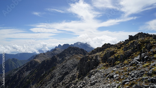 北アルプス登山、大喰岳の下から穂高連峰を見る