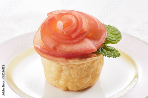 apple, tart, rose, flower, custard, dish, tablecloth, white, mint, leaf, green, food, food, sweet, white, light, confectionery, cake, fruit, cake, foodstuff, baked goods, sweet, apple, pink, table, rose, fresh, image, pink, handcraft