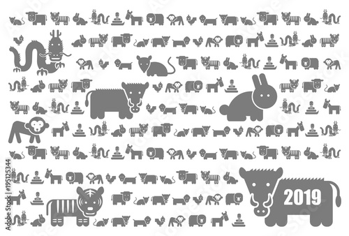 new year, postcard, 2019, boar, wild boar, animal, icon, mouse, cow, tiger, rabbit, dragon, snake, horse, sheep, monkey, chicken, dog, dog, children, tiger, dragon, snake, horse, sheep, monkey, chicken, dog, japan, china, korea, vector, illustration