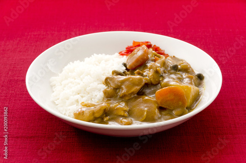 curry, rice, rice, white rice, rice, spice, condiment, chicken, chicken, bird, meat, vegetable, potato, potato, carrot, carrot, carrot, onion, onion, dish, homelike, ragout, food, meal, meal, pickle, red, red, dish, clothes, background