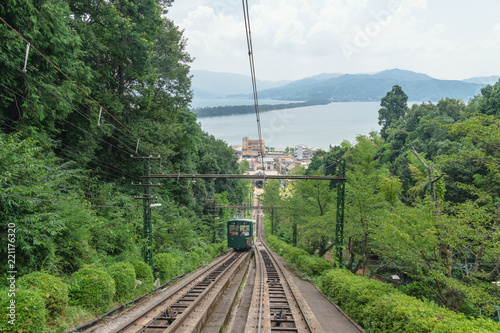 cable car, vehicle, transportation, rail, rail, landscape, green, nature, kyoto, train, rail, tourist attraction, train, tour tourism, travel, japan, sea, open air, showplace, journey, line, slope, car, means of transportation, mountain, view, lookout, countryside, ramp, leaf, landscape
