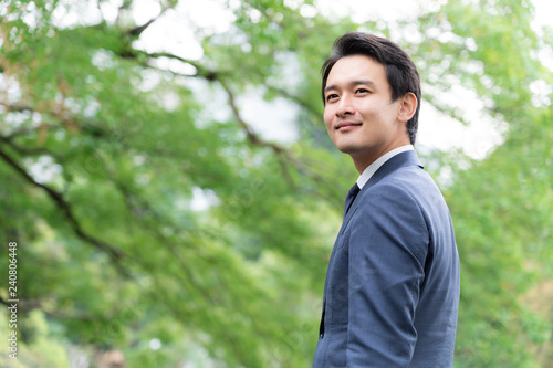 business, people, man, japanese, asian, 30s, middle-aged, businessman, salaried employee, suit, employee, work, work, manpower, freedom, verdure, plant, park, open air, wood, nature, business travel, relocation, smile, smile, look up, future, future, aim