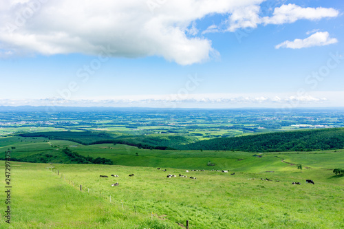 landscape, sky, grass, field, green, nature, meadow, blue, summer, cloud, countryside, mountain, rural, horizon, spring, hill, view, farm, wood, country, panorama, agriculture, lovely, hokkaido, japan, ranch, grass, countryside, meadow, dairy farming, cow, holstein, copy space, cow, grazing
