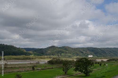 landscape, sky, grass, field, nature, green, cloud, blue, summer, panorama, meadow, mountain, countryside, rural, wood, hill, panoramic, forest, view, country, lovely, agriculture, spring, flooding, cloudburst, watercourse, hokkaido, japan, levee, signs, house, farm