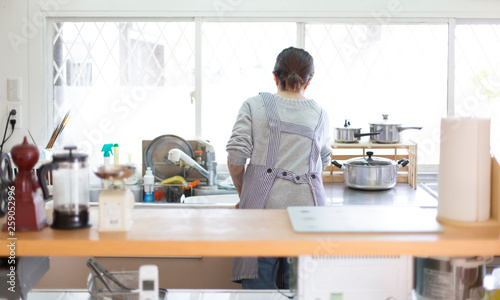 woman, homemaker, japanese, back, kitchen, people, dish, back, kitchen, open air, apron, lifestyle, cooking, cleaning