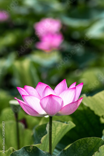 sacred lotus, lotus, plant, summer, sky, blue skies, cloud, pretty, lovely, nature, flower, landscape, sunny, open air, leaf, flower petals, sweet, pink, light, clean, green, pink, copy space, mere, wide-angle lens, full bloom