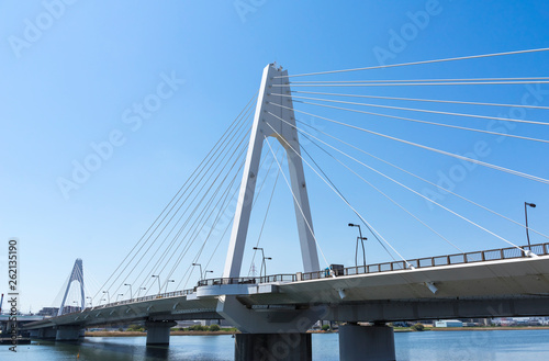 bridge, sky, architecture, blue, cable, steel, construction, structure, city, landmark, route, travel, engineering, stream, metal, braces, concrete, tower, transportation, kawasaki, tokyo, kanagawa, copy space, background