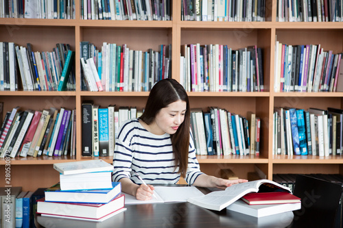 people, lifestyle, japanese, japan, asian, adult, woman, student, waist up, smile, read, seated, examine, learning, book, text, book, table, library, library, bookcase, archive, indoor, study, indoor, girl, campus, reading, earnest, concentration, school