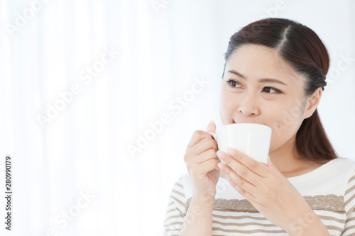people, lifestyle, japanese, japan, asian, adult, woman, missy, 30s, youth, waist up, smile, possess, drink, coffee, coffee cup, room, drape, indoor, white, copy space, white background, home, house, house, home, vacation, relax, relax, sweet, light, young, morning, natural, homemaker, casual