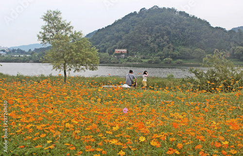 field, landscape, flower, nature, sky, poppy, summer, meadow, red, spring, blue, countryside, green, farming, grass, rural, farm, plant, mountain, country, yellow, forest
