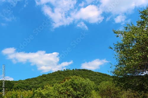 sky, landscape, nature, grass, blue, green, cloud, summer, wood, forest, mountain, blue, field, white, rural, countryside, hill, park, outdoors, view, fall, refreshing, background, wallpaper, ease, relax, carefree, slowly, japan, high, leaf, smile, fun, joyful, blue skies