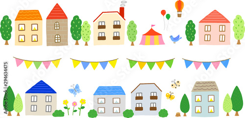 house, garland, house, sweet, wood, colourful, balloon, blue, red, flower, bird, butterfly, green, illustration, vector