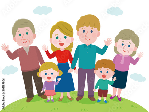丘の上で手を振る 外国人 三世代家族 イラスト
