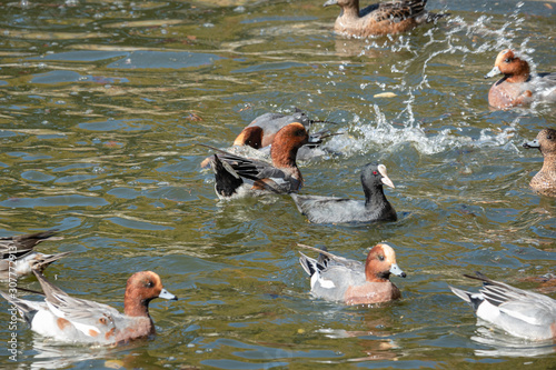 coot, duck, bird, migrant, mob, group, mere, lake, water surface, water, animal, nature, wildlife, mere, wild, swimming, anas platyrhynchos, stream, swim, water bird, wing, beak, brown