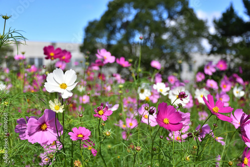 cosmos, fall, flower, pink, nature, garden, plant, field, green, flowering, plant, lovely, floral, red, colourful, bloom, white, beauty, pigmentation, grass, up, sunny, sky, blue skies, blue, healing, healing