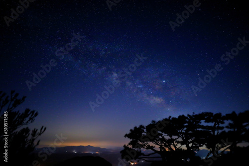sky, forest, night, landscape, cloud, nature, silhouette, blue, evening, tonight, dark, star, light, beautiful, orange, mountain, black, milky way, beautiful, pretty, fashionable, korea, dawn, celestial bodies, light, nature, mountain, spring