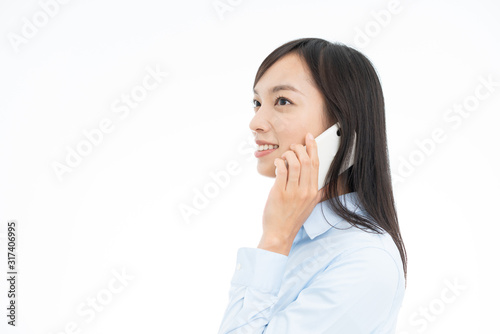 woman, business, businesswoman, isolated, young, portrait, lovely, happy, smile, people, smiling, person, beauty, professional, confident, success, face, 1, standing, lady, office, suit, sweet, work, white background, beauty, copy space, studio, businessman, japanese, asian, shirt, blue, sky blue, call, mobile, mobile phone, call, speaking, trapped, conversation, call, communication, mobile