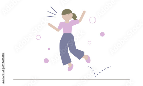 woman, young, jump, jump, happy, happiness, merry, lively, energetic, dancing, ponytail, homemaker, 30s, white, person, vector, illustration