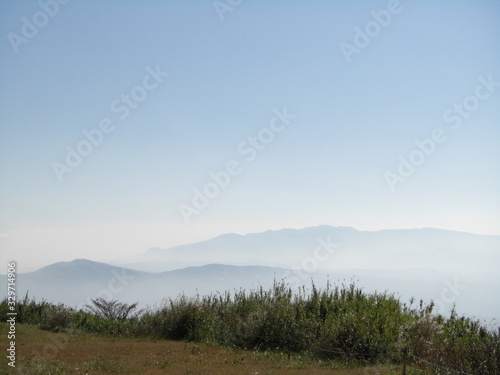 landscape, sky, mountain, nature, mountain, cloud, grass, forest, blue, green, wood, view, blur, travel, fall, meadow, meadow, peak, gradation, range, blue skies, far, blur, dream