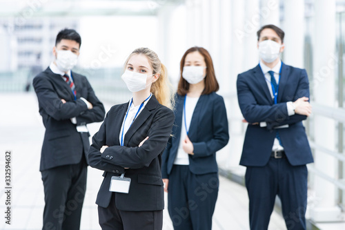 mask, business, prevention, flu, businessman, suit, employee, career woman, corporation, corporate, bonding, teamwork, fellow, portrait, plural, cooperation, work, team, virus, corona, hay fever, pollen, cold, allergy, contagion, infection, cough, staff, global, international, medical care, microbe