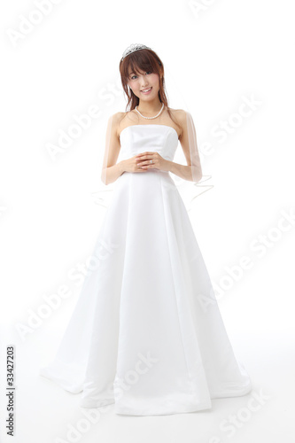 bridal gown, dress, marriage, wedding, bride, people, man, woman, wedding, indoor, indoor, happy, happiness, bride, japan, japanese, orient, young, youth, asia, asian, white background, white, smile, smile, smile, ring, tiara, dress-up, brown-haired, sweet, clean, lovely, studio, pearl, necklace