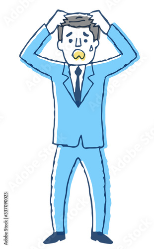 people, illustration, expression, front, employee, suit, cravat, man, salaried employee, unrest, business, work, 30s, 50's, young, middle-aged, manager, japanese, businessman, trouble, apprehension, pose, flop, contemplate, fatigue, employment, overwork, small business, chop, downsizing, social issue, work