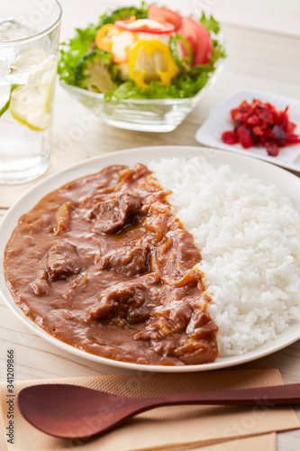 curry, beef, rice, spice, salad, water, spoon, closeup, pickle, set, lunch, menu, potato salad