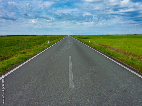 route, highway, sky, asphalt, landscape, travel, rural, horizon, field, blue, nature, way, country, green, grass, cloud, route, countryside, summer, journey, straight, empty, perspective, line, meadow