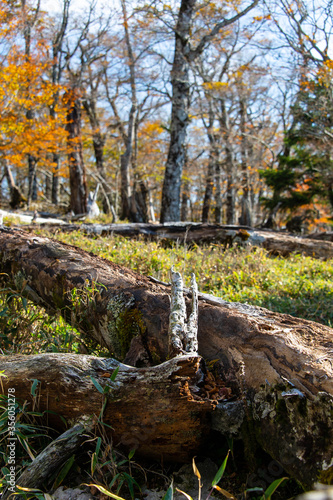 紅葉している山で倒れた樹木