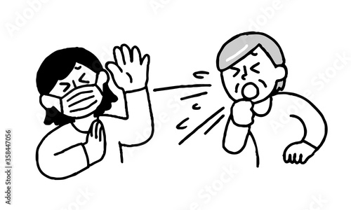 咳するシニア女性と嫌がるマスク私服女性(シンプル)