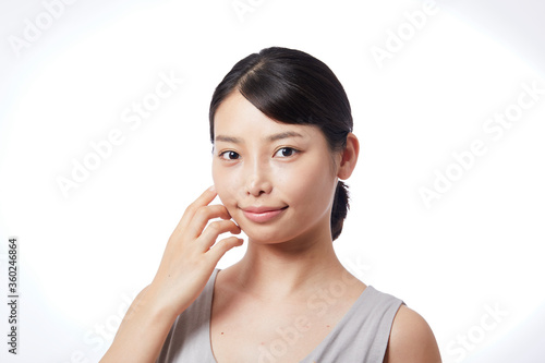 este, skincare, singlet, beauty, health care, make-up, alone, waist up, people, health, woman, indoor, smile, smile, hand, japan, japanese, refreshing, white, white background, bare skin, clean, lovely, cosmetic, skin, young, touch, touch, face