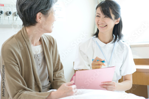 medical care, adult, two people, woman, elderly, aged, aged, 60's, 30s, middle-aged, daytime, indoor, colours, photo, asian, japanese, hospital, patient, uniform, labcoat, nurse, waist up, smile, smile, light, possess, document, examine, pen, black hair, bed, pillow, ward, care, assistance, love, hope, confidence, protection, health, speaking, facility, occupation, blame, hope, drape, window, commitment, relax, peace