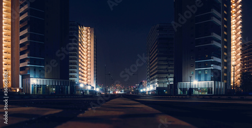city, night, traffic, route, urban, street, horizon, architecture, city landscape, building, downtown, highway, car, light, business, china, skyscraper, blue, sky, dubai, motion, tonight, transportation