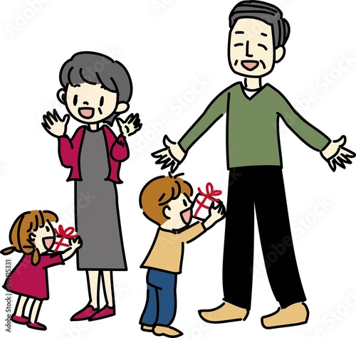 おじいちゃんおばあちゃんにプレゼントを渡す子供達のイラスト