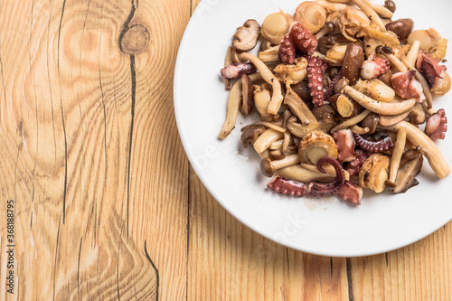 scallop, seafood, seafood, seafood, seafood, seafood, octopus, octopus, octopus, mushroom, mushroom, mushroom, vegetable, stir fry, fresh, fresh, food, foodstuff, material, dish, cooking, side dish, food, side dish, handcraft, lunch, meal, table, hood, dinner, dinner