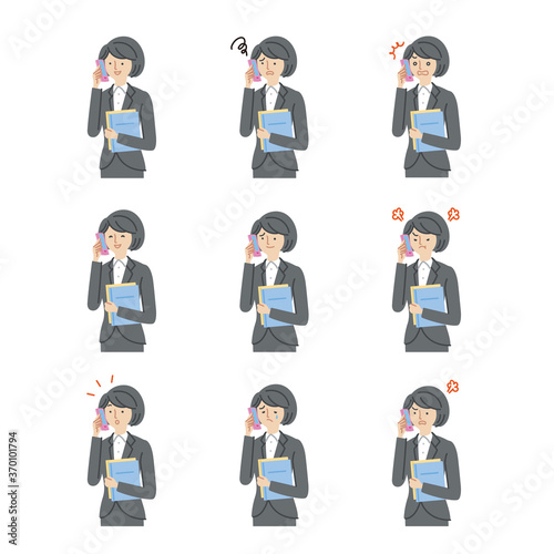 woman, business, smartphone, expression, variation, vector, set, smartphone, speaking, call, mobile phone, sweet, illustration, waist up, pose, work, suit, smile, smile, surprised, cry, resent, surprised, sad, anger, tear, surprise, face, conversation, japanese, young, 30s, trouble, mobile, people, feeling, stress, rejoice, smile, career woman, material