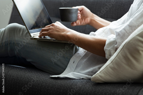lifestyle, people, vacation, notebook, coffee break, man, asian, japanese, indoor, indoor, house, home, live, man, adult, 30s, operation, mobile, computer, personal computer, personal computer, casual, off, relax, possess, drink, drink, coffee, coffee cup, cup, break