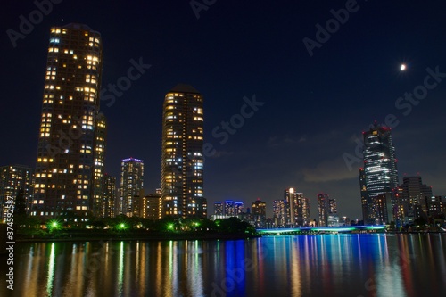 月の浮かぶ隅田川夜景 高層ビル群と佃大橋ライトアップ