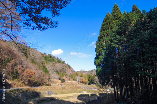 fall, countryside, village, conifer, broadleaf tree, miscanthus sinensis, landscape, sky, sunny, blue skies, blue, blue, wood, grove, leaf, green, nature, open air, way, route, mountain, green, japan, osaka, view, rural